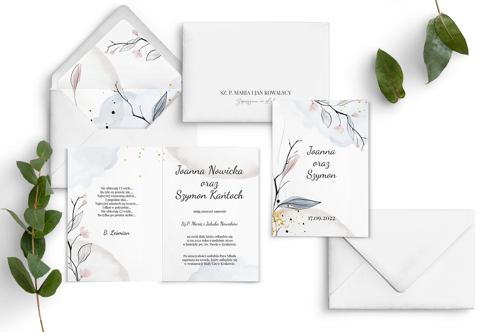 Delikatne akwarelowe składane Zaproszenia ślubne Watercolor Wedding z kopertą i wklejką