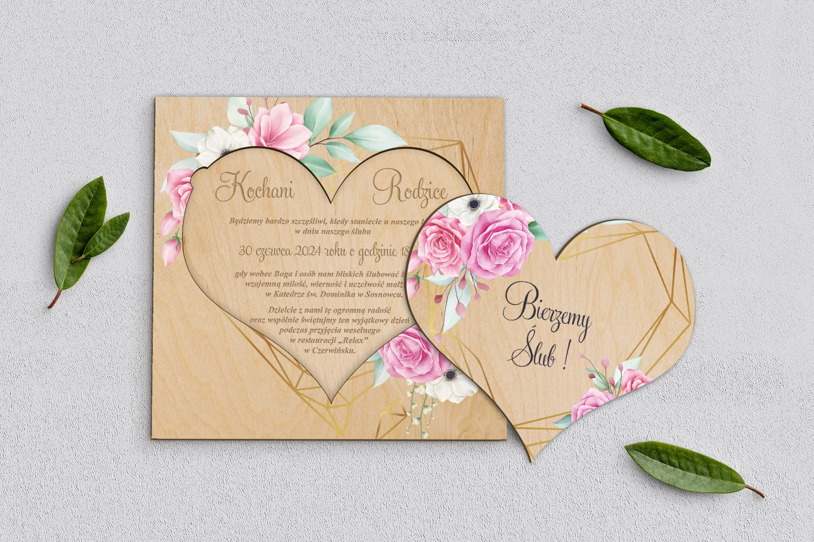 Drewniane Zaproszenie dla Rodziców - Geometryczne Serce motyw 1