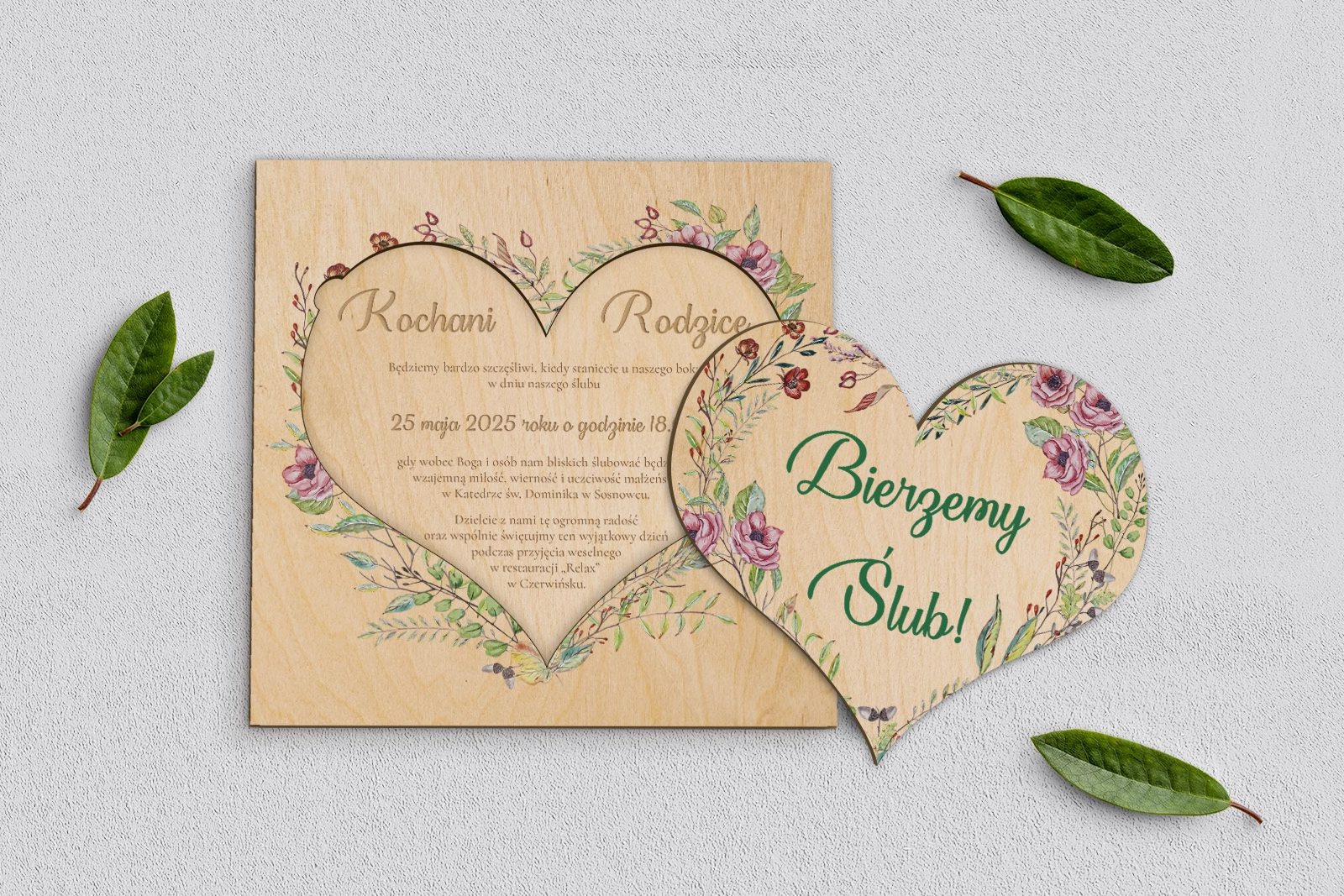 Drewniane Zaproszenie dla Rodziców - Heart of Flowers - Motyw 3