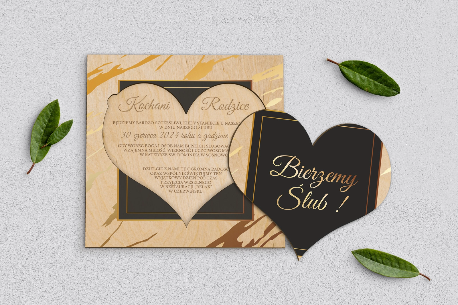 Drewniane Zaproszenie dla Rodziców - Marmur i Złoto Motyw 3