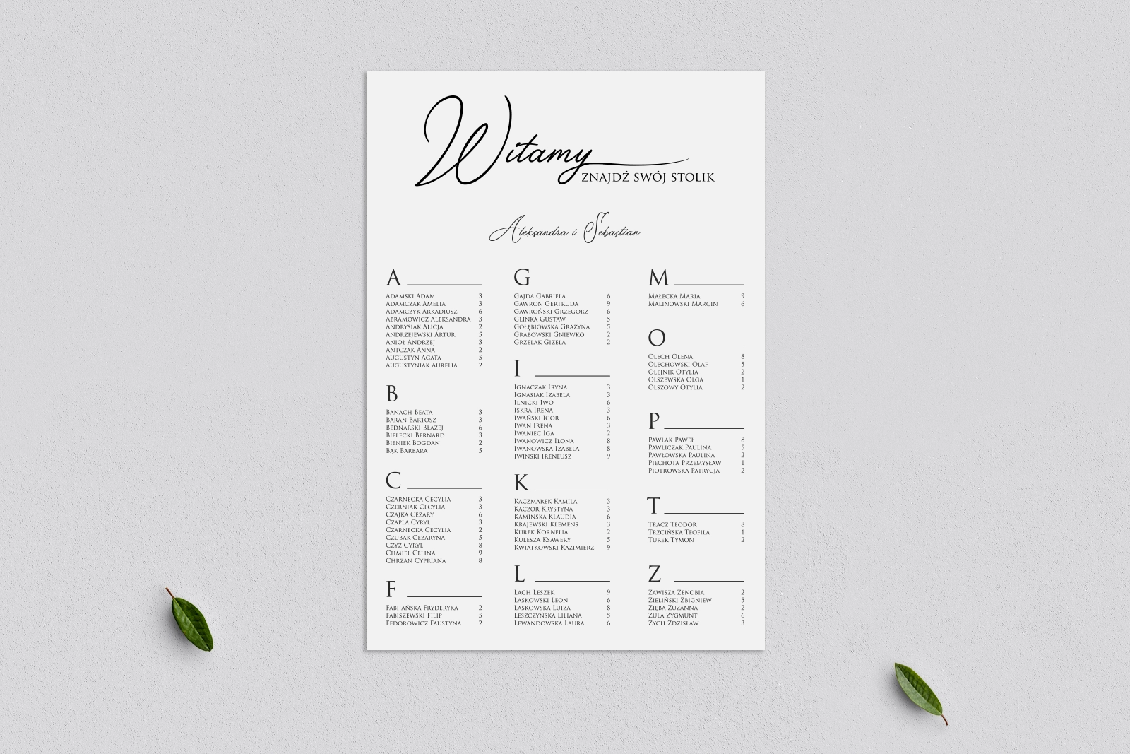 Elegancki plan stołów weselnych z uporządkowaną alfabetycznie listą gości