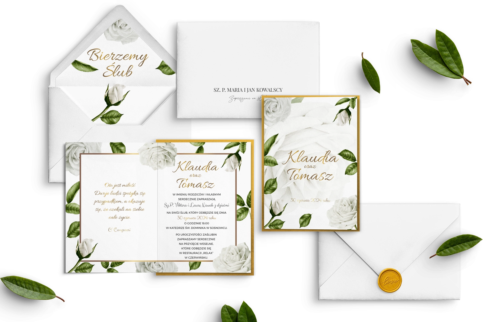 Eleganckie zaproszenia ślubne w których białe róże otulają złotą ramkę. Drukowane na grubych papierach o różnych fakturach.