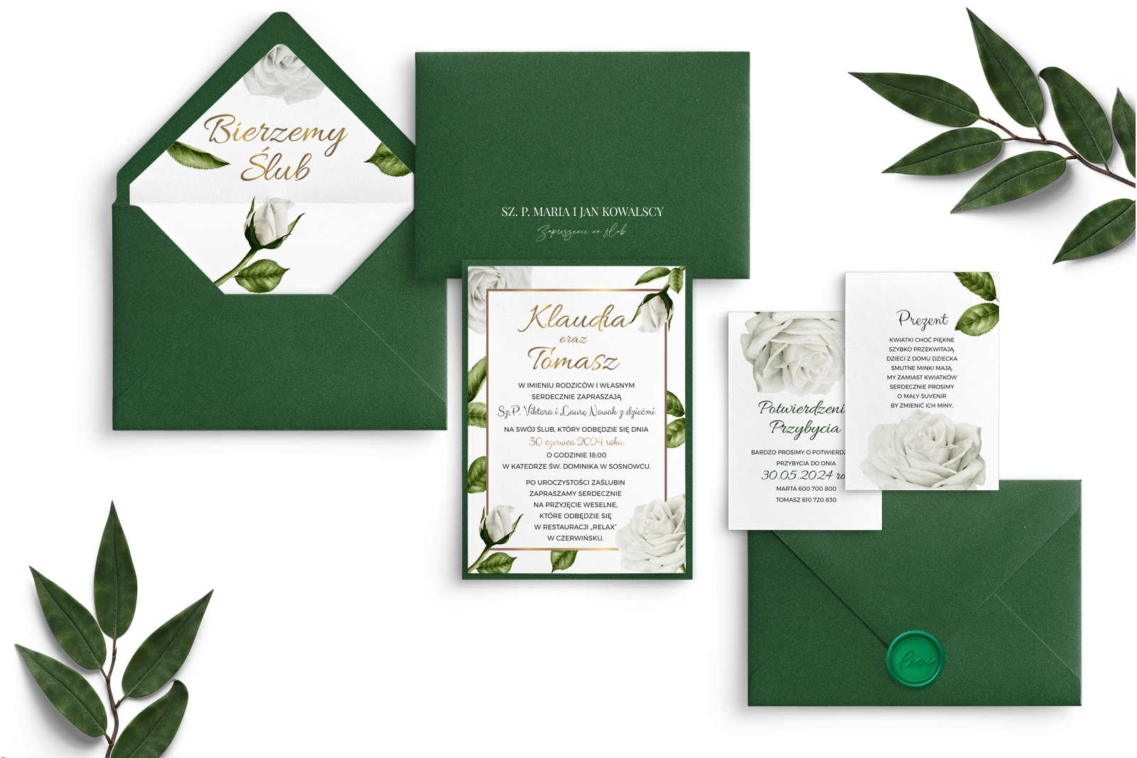 Eleganckie Zaproszenia ślubne Dream z podklejką, wkładkami i kopertą z zielonym lakiem