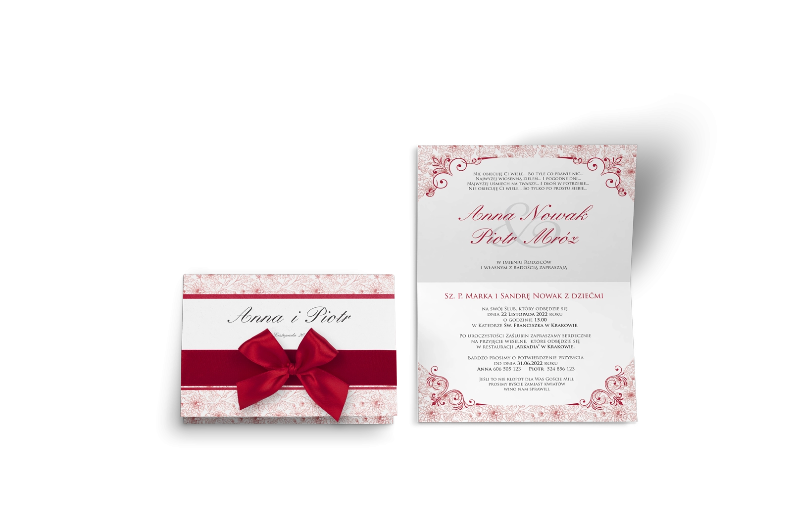 Zaproszenie ślubne Ornaments to elegancja propozycja stworzona w kolorze bordowym. Główna karta zaproszenia wykonana jest z wysokich jakości papierów o gramaturze od 246 gr do 300 gr. Sami możecie wybrać ich strukturę. Główną aplikacją jest wstążka satynowa przyklejona do zaproszenia w postaci paska, na którym spoczywa misternie i dokładnie zawiązana kokarda. Jako dodatki do tego wzoru możecie wybrać kopertę zwykłą lub koperty krzyżowe z piękną wklejką i kolorową personalizacją. Aby zaproszenie było jeszcze ciekawe polecamy dodać do niego dodatkowe wkładki.