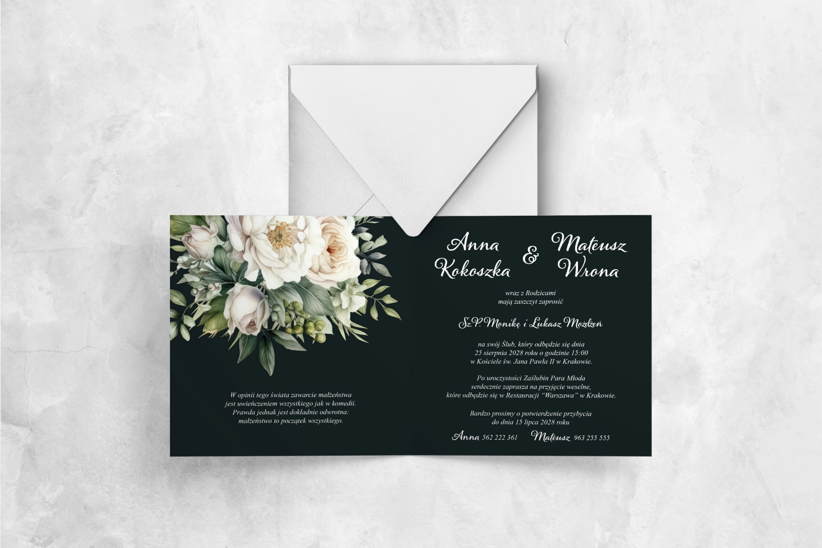 Na tej karcie produktu kupujesz Zaproszenia Ślubne Składane Kwadratowe w konfiguracji określonej w specyfikacji. Nasze zaproszenia ślubne są drukowane na wybranym przez Ciebie papierze przy użyciu wysokiej jakości drukarki produkcyjnej, która zapewnia mocne, nasycone kolory oraz czytelny wyrazisty tekst.