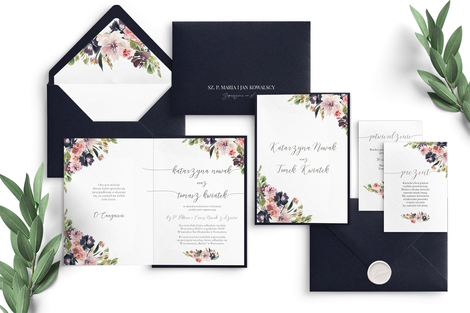 Granatowe Zaproszenia ślubne PasteLove- Składane z granatową kopertą, białym lakiem, wklejką i dwoma wkładkami