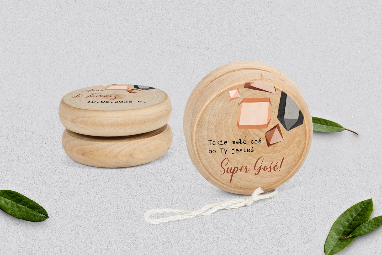 Jojo to oryginalny i nietypowy prezent dla gości weselnych, który szczególnie spodoba się dzieciakom. Nasze personalizowane jojo dostępne jest w wersji bez nadruku, z nadrukiem jednostronnym oraz z nadrukiem dwustronnym. Nadruk wykonywany jest na folii transparentnej, która jest naklejana na jojo, przez co uzyskujemy lepszą jakość wydruku. Z jednej strony możemy umieścić Wasze imiona i datę ślubu, a z drugiej - zabawny napis czy krótkie podziękowanie. Jojo możemy wykonać w każdym motywie z dowolnej kolekcji tak, żeby pasowało do wybranych zaproszeń ślubnych i pozostałych dodatków weselnych.