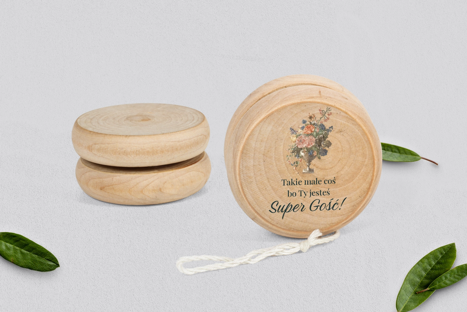 Jojo to oryginalny i nietypowy prezent dla gości weselnych, który szczególnie spodoba się dzieciakom. Nasze personalizowane jojo dostępne jest w wersji bez nadruku, z nadrukiem jednostronnym oraz z nadrukiem dwustronnym. Nadruk wykonywany jest na folii transparentnej, która jest naklejana na jojo, przez co uzyskujemy lepszą jakość wydruku. Z jednej strony możemy umieścić Wasze imiona i datę ślubu, a z drugiej - zabawny napis czy krótkie podziękowanie. Jojo możemy wykonać w każdym motywie z dowolnej kolekcji tak, żeby pasowało do wybranych zaproszeń ślubnych i pozostałych dodatków weselnych.