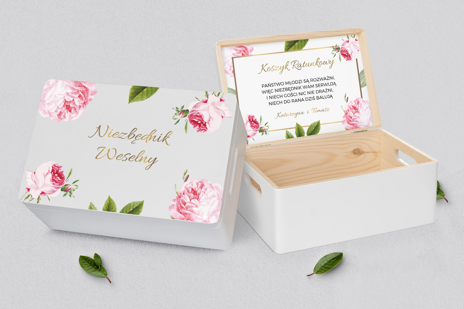 Drewniany koszyczek ratunkowy w kolorze białym z pięknym grawerem w różnych stylach. Solidnie i dokładnie wykonane. Bez problemu pomieści najpotrzebniejsze przedmioty, które mogą przydać się Waszym gościom na weselu. Pudełko można dowolnie spersonalizować własnymi imionami lub dowolnymi napisami. Kolor białym doskonale wpasuje się w każde wesele.