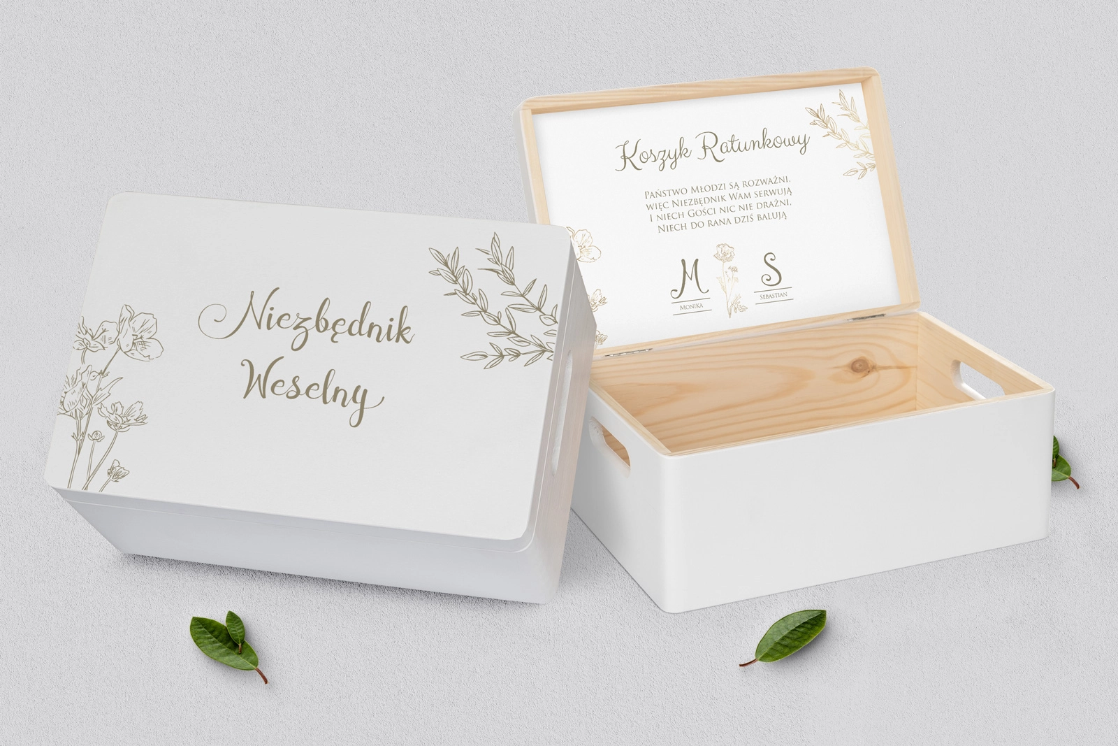 Drewniany koszyczek ratunkowy w kolorze białym z pięknym grawerem w różnych stylach. Solidnie i dokładnie wykonane. Bez problemu pomieści najpotrzebniejsze przedmioty, które mogą przydać się Waszym gościom na weselu. Pudełko można dowolnie spersonalizować własnymi imionami lub dowolnymi napisami. Kolor białym doskonale wpasuje się w każde wesele.