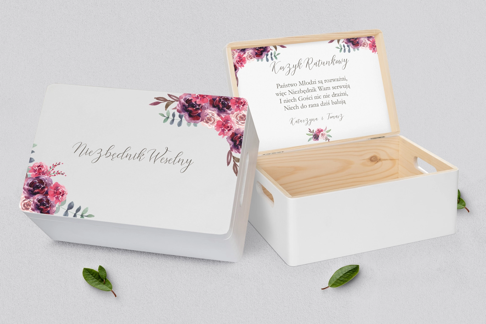 Drewniany koszyczek ratunkowy w kolorze białym z pięknym grawerem w różnych stylach. Solidnie i dokładnie wykonane. Bez problemu pomieści najpotrzebniejsze przedmioty, które mogą przydać się Waszym gościom na weselu. Pudełko można dowolnie spersonalizować własnymi imionami lub dowolnymi napisami. Kolor białym doskonale wpasuje się w każde wesele.