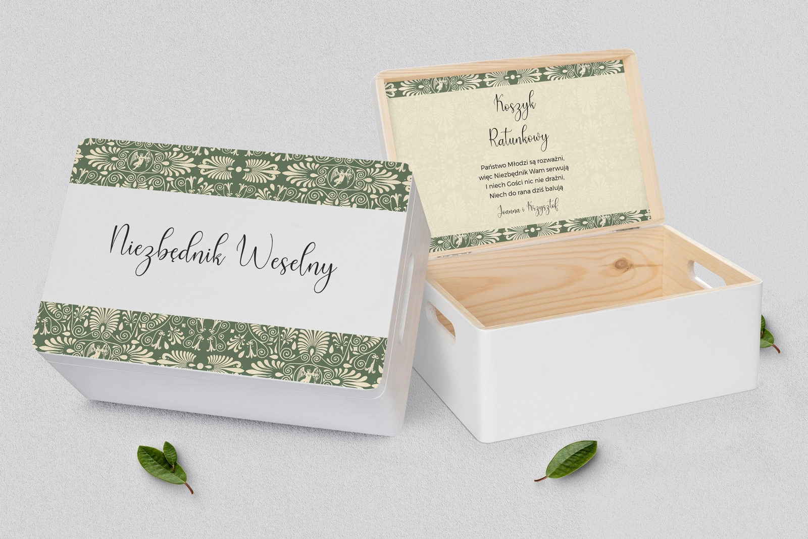Drewniany koszyczek ratunkowy w kolorze białym z pięknym grawerem w różnych stylach. Solidnie i dokładnie wykonane. Bez problemu pomieści najpotrzebniejsze przedmioty, które mogą przydać się Waszym gościom na weselu. Pudełko można dowolnie spersonalizować własnymi imionami lub dowolnymi napisami. Kolor białym doskonale wpasuje się w każde wesele.