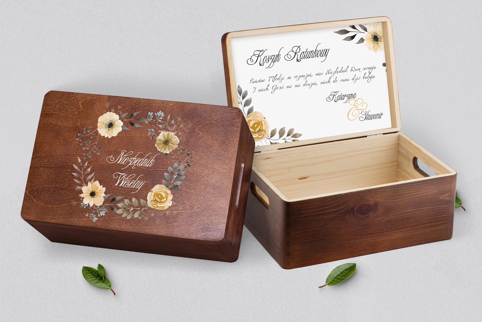 Drewniany koszyczek ratunkowy w kolorze brązowym z pięknym grawerem w różnych stylach. Solidnie i dokładnie wykonane. Bez problemu pomieści najpotrzebniejsze przedmioty, które mogą przydać się Waszym gościom na weselu. Pudełko można dowolnie spersonalizować własnymi imionami lub dowolnymi napisami. Kolor brązowy doskonale wpasuje się w każde wesele.