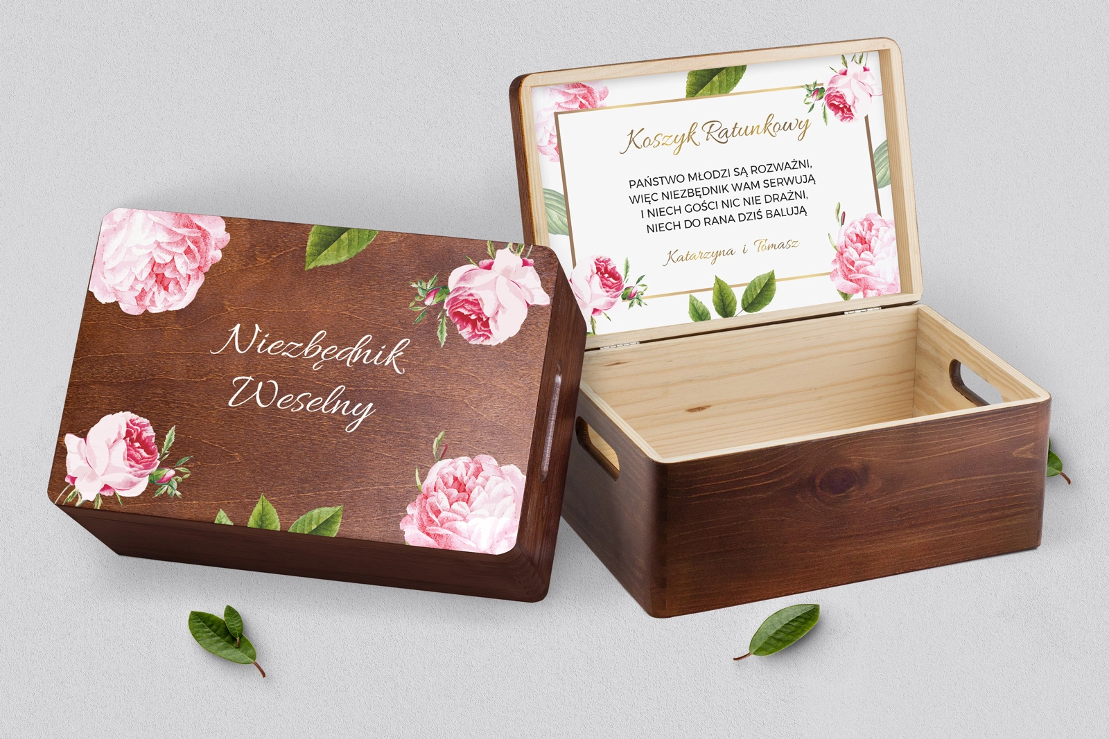 Drewniany koszyczek ratunkowy w kolorze brązowym z pięknym grawerem w różnych stylach. Solidnie i dokładnie wykonane. Bez problemu pomieści najpotrzebniejsze przedmioty, które mogą przydać się Waszym gościom na weselu. Pudełko można dowolnie spersonalizować własnymi imionami lub dowolnymi napisami. Kolor brązowy doskonale wpasuje się w każde wesele.
