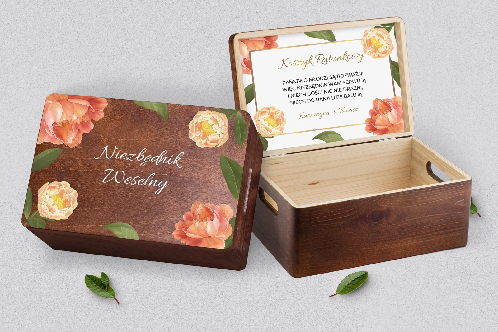 Drewniany koszyczek ratunkowy w kolorze brązowym z pięknym grawerem w różnych stylach. Solidnie i dokładnie wykonane. Bez problemu pomieści najpotrzebniejsze przedmioty, które mogą przydać się Waszym gościom na weselu. Pudełko można dowolnie spersonalizować własnymi imionami lub dowolnymi napisami. Kolor brązowy doskonale wpasuje się w każde wesele.