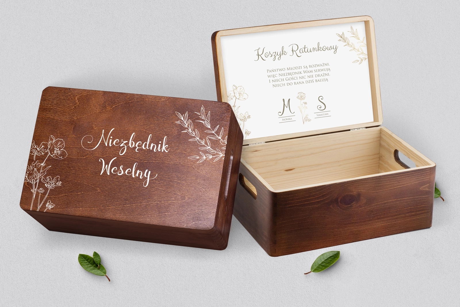 Drewniany koszyczek ratunkowy w kolorze brązowym z pięknym grawerem w różnych stylach. Solidnie i dokładnie wykonane. Bez problemu pomieści najpotrzebniejsze przedmioty, które mogą przydać się Waszym gościom na weselu. Pudełko można dowolnie spersonalizować własnymi imionami lub dowolnymi napisami. Kolor brązowy doskonale wpasuje się w każde wesele.