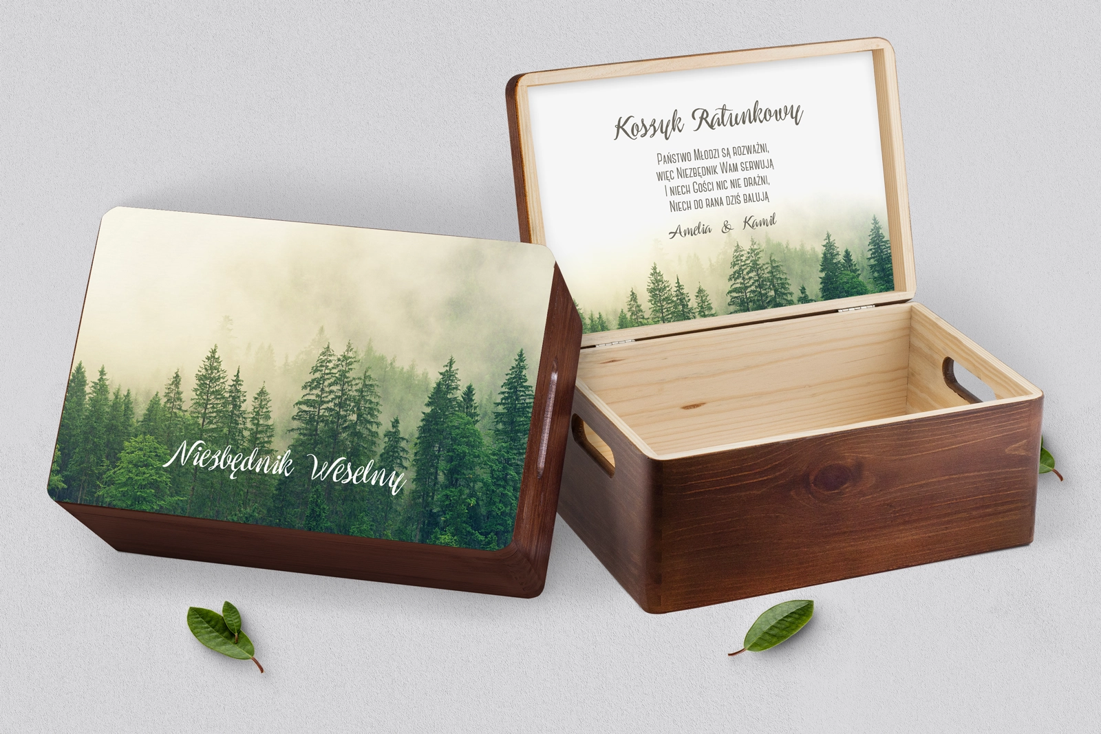 Drewniany koszyczek ratunkowy w kolorze brązowym z pięknym grawerem w różnych stylach. Solidnie i dokładnie wykonane. Bez problemu pomieści najpotrzebniejsze przedmioty, które mogą przydać się Waszym gościom na weselu. Pudełko można dowolnie spersonalizować własnymi imionami lub dowolnymi napisami. Kolor brązowy doskonale wpasuje się w każde wesele.