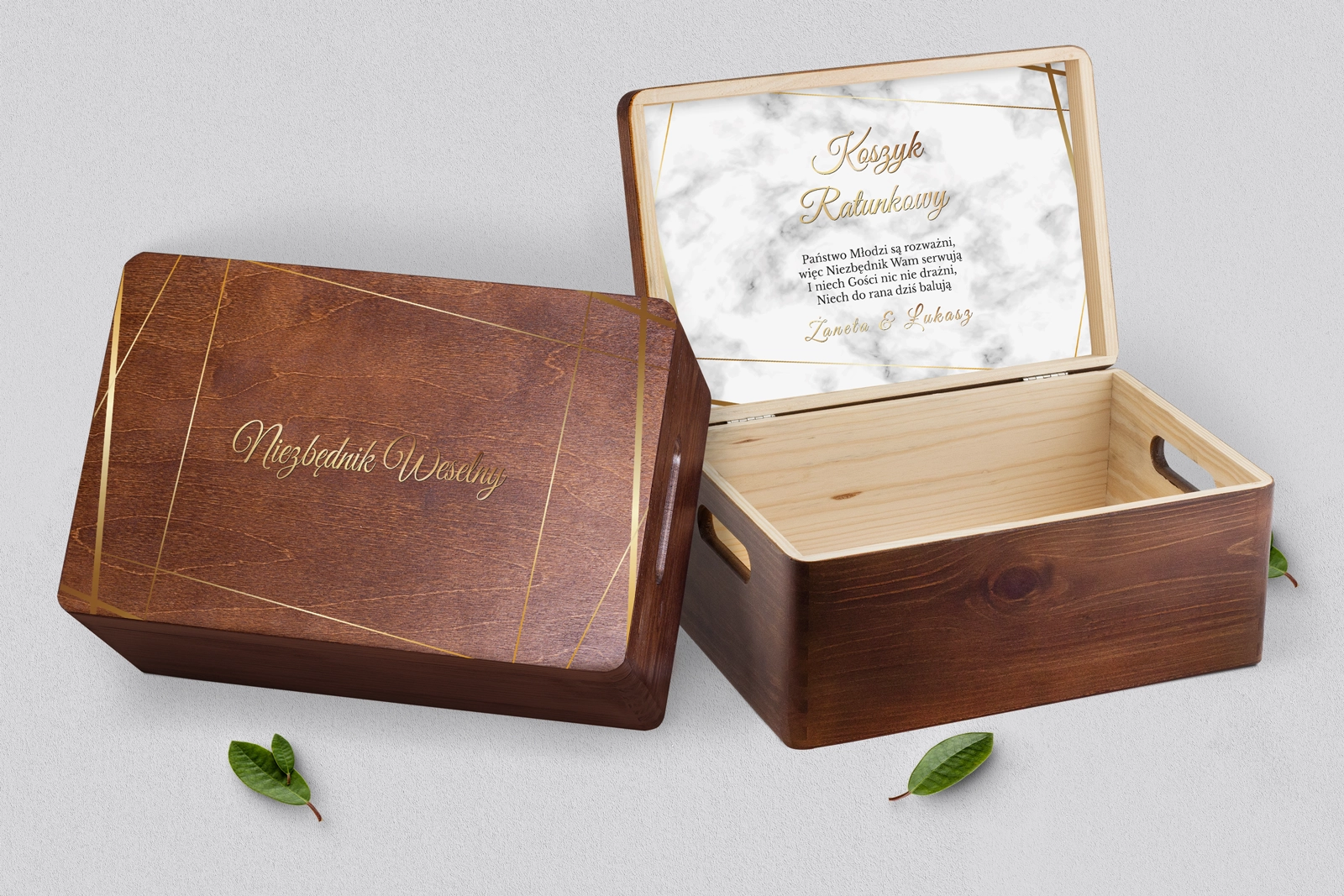 Drewniany koszyczek ratunkowy w kolorze brązowym z pięknym grawerem w różnych stylach. Solidnie i dokładnie wykonane. Bez problemu pomieści najpotrzebniejsze przedmioty, które mogą przydać się Waszym gościom na weselu. Pudełko można dowolnie spersonalizować własnymi imionami lub dowolnymi napisami. Kolor brązowy doskonale wpasuje się w każde wesele.