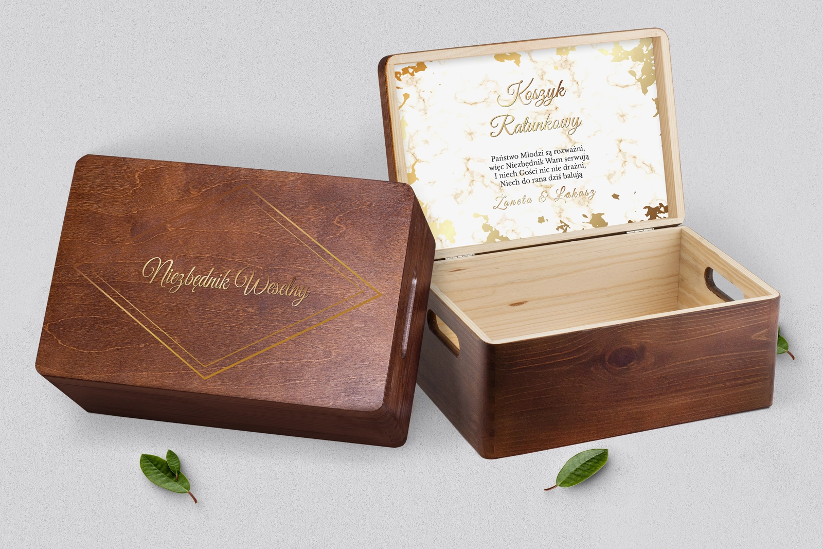 Drewniany koszyczek ratunkowy w kolorze brązowym z pięknym grawerem w różnych stylach. Solidnie i dokładnie wykonane. Bez problemu pomieści najpotrzebniejsze przedmioty, które mogą przydać się Waszym gościom na weselu. Pudełko można dowolnie spersonalizować własnymi imionami lub dowolnymi napisami. Kolor brązowy doskonale wpasuje się w każde wesele.