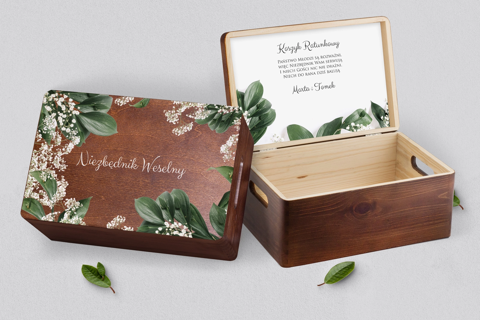 Drewniany koszyczek ratunkowy w kolorze brązowym z pięknym grawerem w różnych stylach. Solidnie i dokładnie wykonane. Bez problemu pomieści najpotrzebniejsze przedmioty, które mogą przydać się Waszym gościom na weselu. Pudełko można dowolnie spersonalizować własnymi imionami lub dowolnymi napisami. Kolor brązowy doskonale wpasuje się w każde wesele.