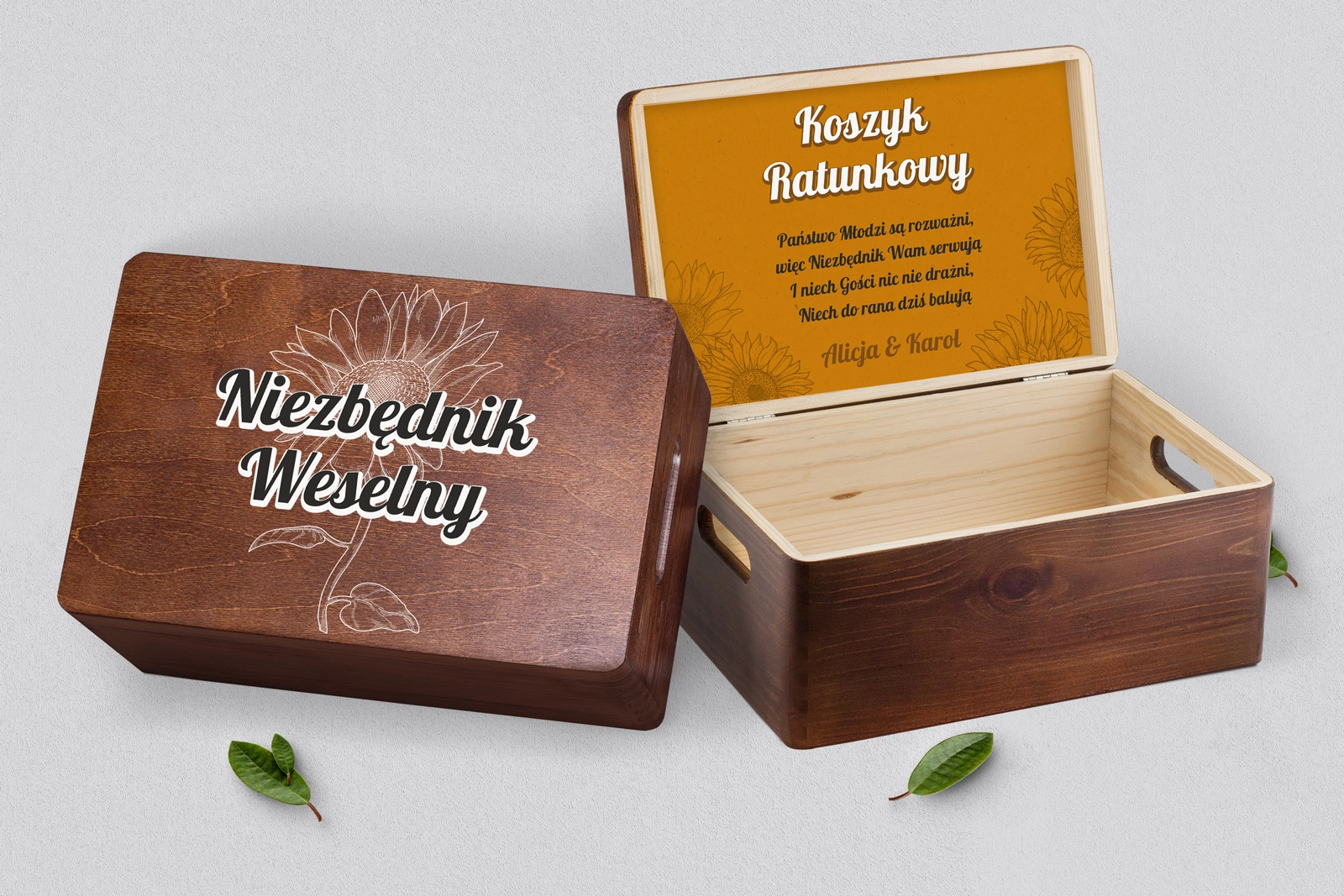 Drewniany koszyczek ratunkowy w kolorze brązowym z pięknym grawerem w różnych stylach. Solidnie i dokładnie wykonane. Bez problemu pomieści najpotrzebniejsze przedmioty, które mogą przydać się Waszym gościom na weselu. Pudełko można dowolnie spersonalizować własnymi imionami lub dowolnymi napisami. Kolor brązowy doskonale wpasuje się w każde wesele.