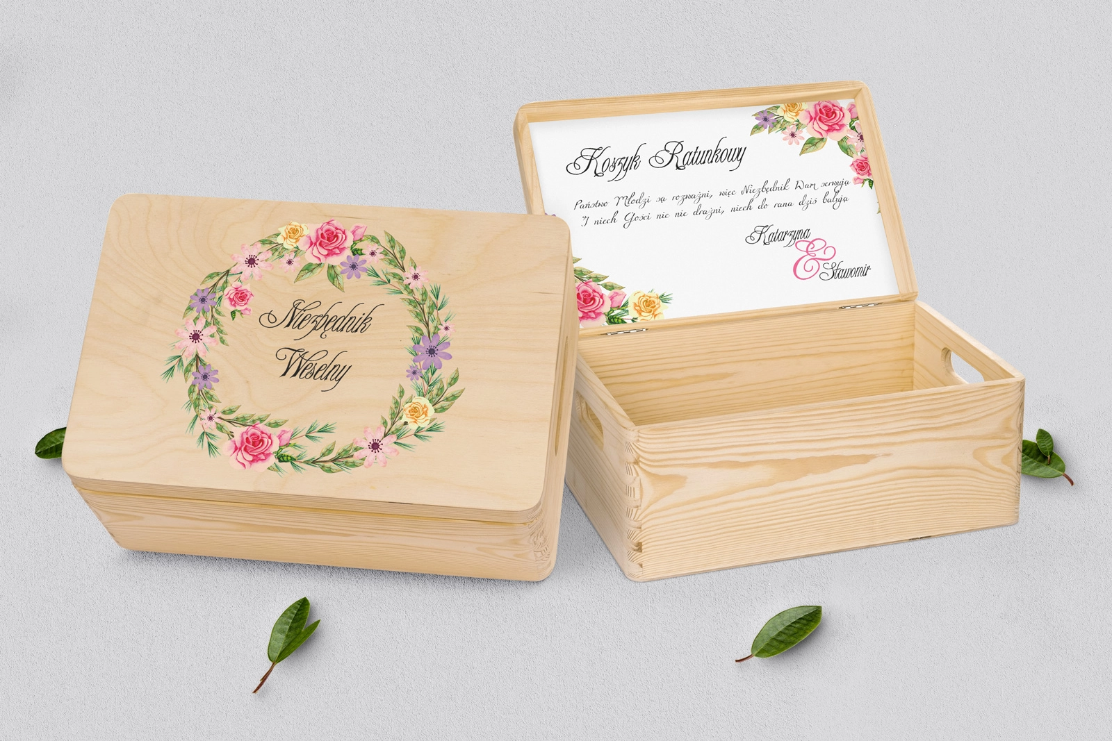 Drewniany koszyczek ratunkowy w kolorze naturalnym z pięknym grawerem w różnych stylach. Solidnie i dokładnie wykonane. Bez problemu pomieści najpotrzebniejsze przedmioty, które mogą przydać się Waszym gościom na weselu. Pudełko można dowolnie spersonalizować własnymi imionami lub dowolnymi napisami. Kolor naturalny doskonale wpasuje się w każde wesele.