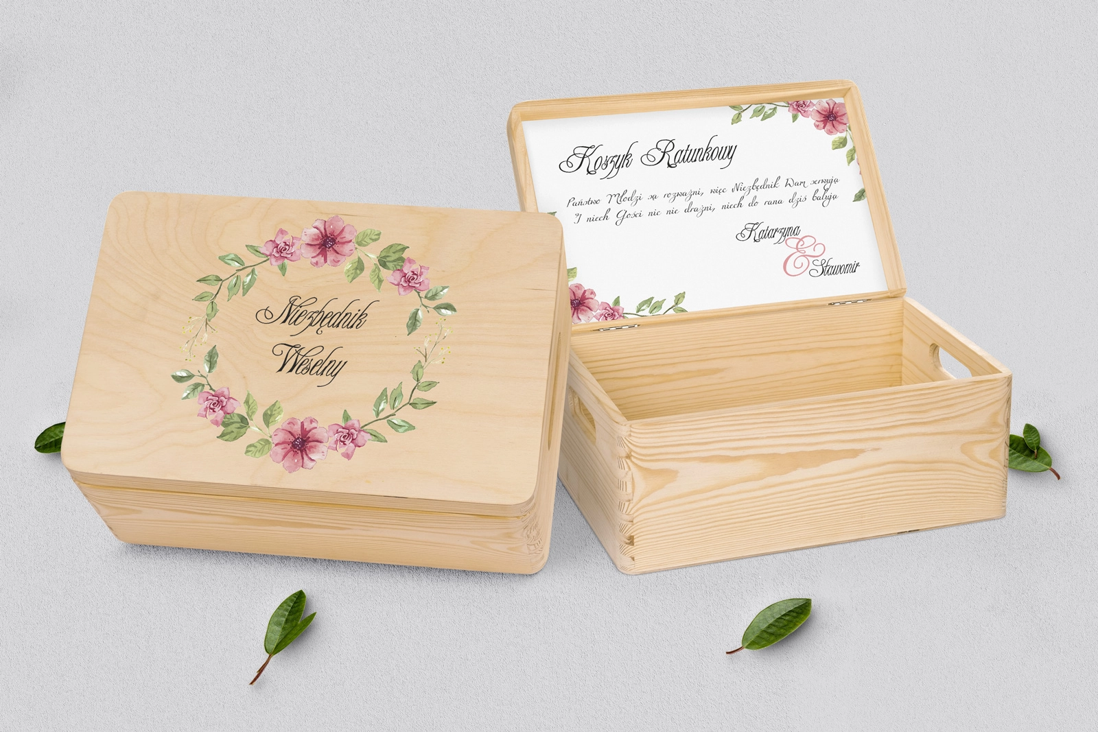 Drewniany koszyczek ratunkowy w kolorze naturalnym z pięknym grawerem w różnych stylach. Solidnie i dokładnie wykonane. Bez problemu pomieści najpotrzebniejsze przedmioty, które mogą przydać się Waszym gościom na weselu. Pudełko można dowolnie spersonalizować własnymi imionami lub dowolnymi napisami. Kolor naturalny doskonale wpasuje się w każde wesele.
