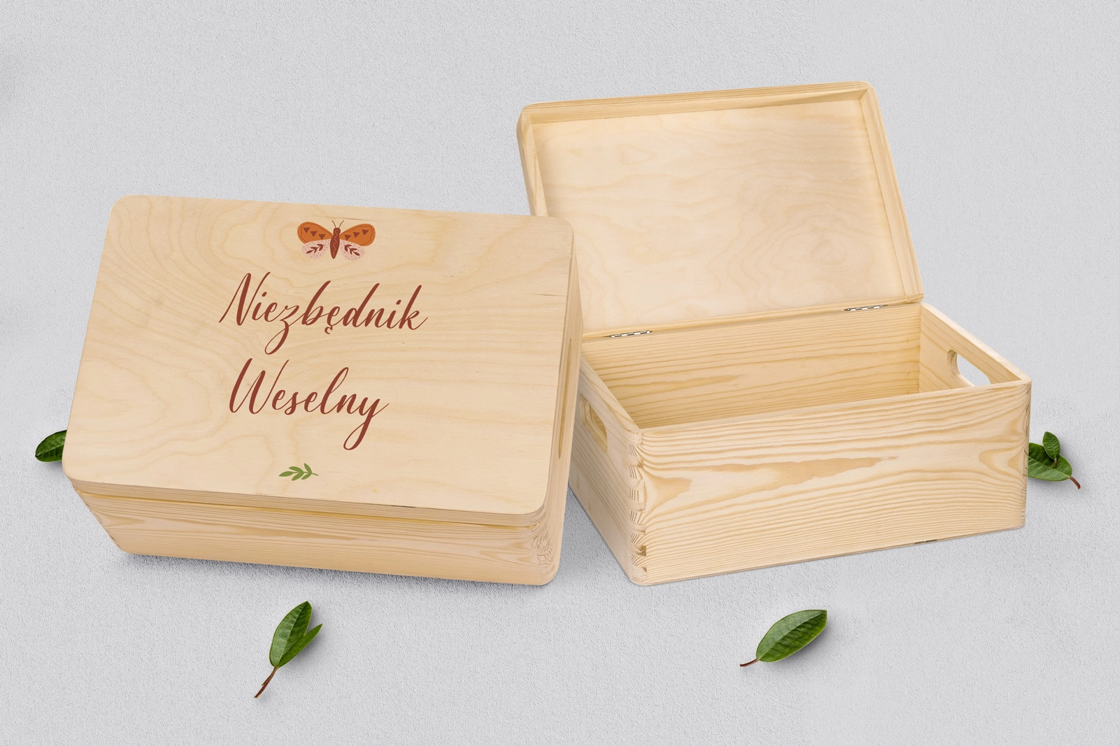 Drewniany koszyczek ratunkowy w kolorze naturalnym z pięknym grawerem w różnych stylach. Solidnie i dokładnie wykonane. Bez problemu pomieści najpotrzebniejsze przedmioty, które mogą przydać się Waszym gościom na weselu. Pudełko można dowolnie spersonalizować własnymi imionami lub dowolnymi napisami. Kolor naturalny doskonale wpasuje się w każde wesele.