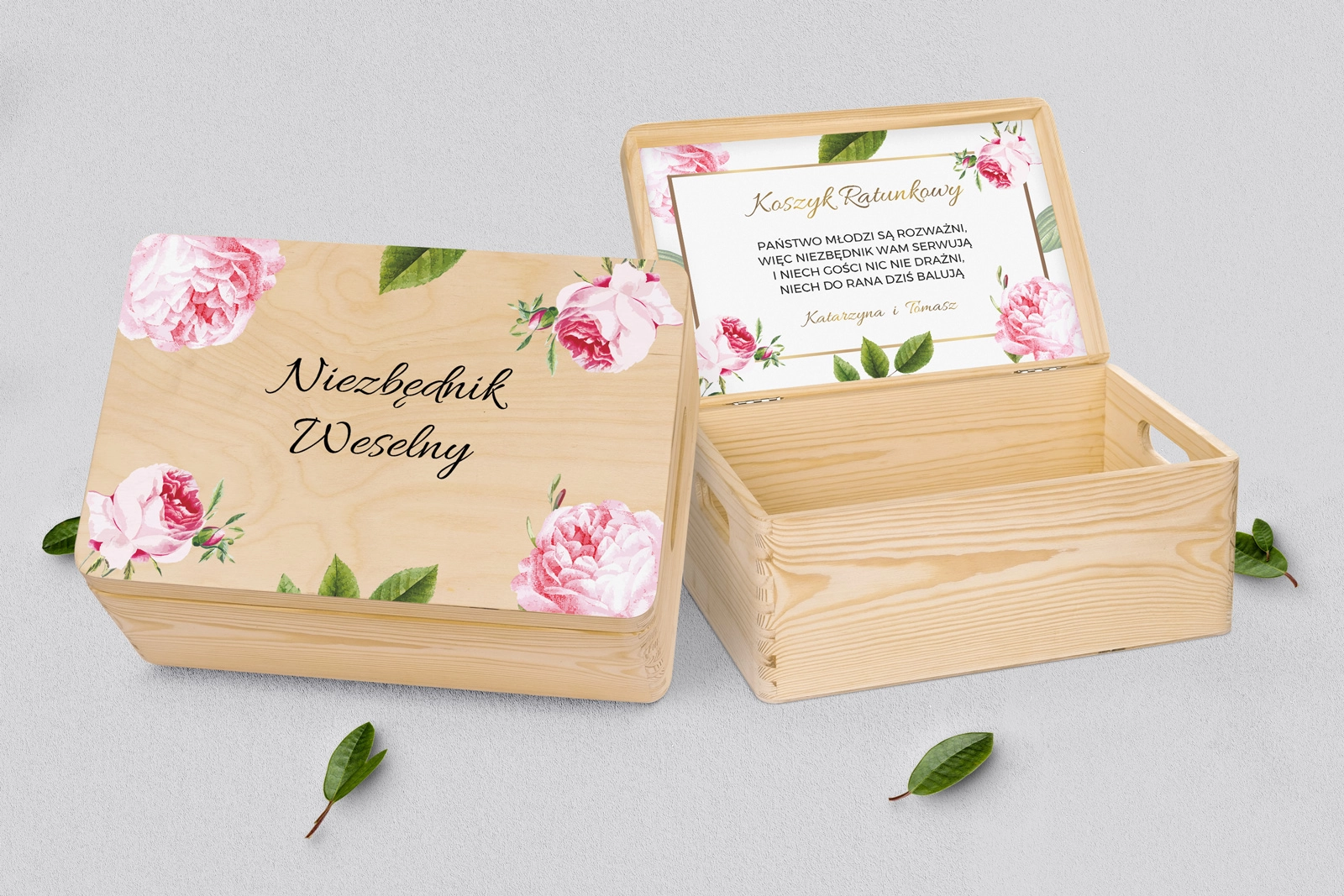 Drewniany koszyczek ratunkowy w kolorze naturalnym z pięknym grawerem w różnych stylach. Solidnie i dokładnie wykonane. Bez problemu pomieści najpotrzebniejsze przedmioty, które mogą przydać się Waszym gościom na weselu. Pudełko można dowolnie spersonalizować własnymi imionami lub dowolnymi napisami. Kolor naturalny doskonale wpasuje się w każde wesele.