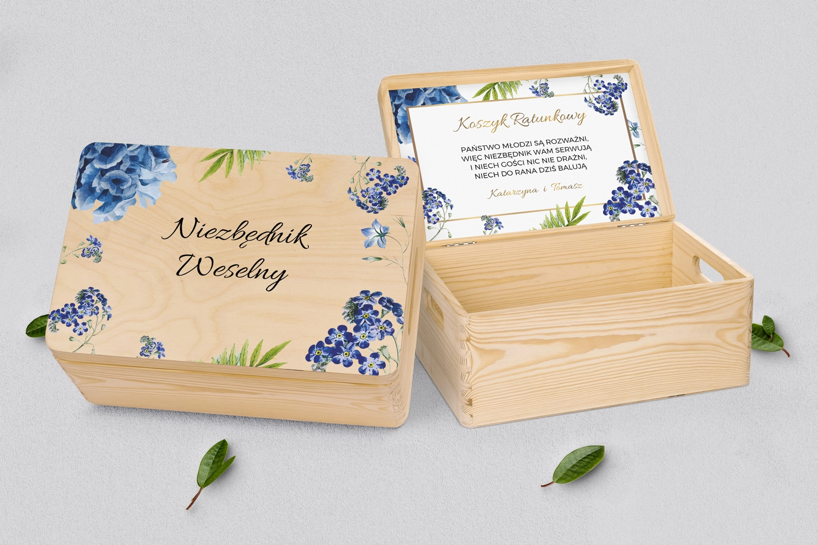 Drewniany koszyczek ratunkowy w kolorze naturalnym z pięknym grawerem w różnych stylach. Solidnie i dokładnie wykonane. Bez problemu pomieści najpotrzebniejsze przedmioty, które mogą przydać się Waszym gościom na weselu. Pudełko można dowolnie spersonalizować własnymi imionami lub dowolnymi napisami. Kolor naturalny doskonale wpasuje się w każde wesele.
