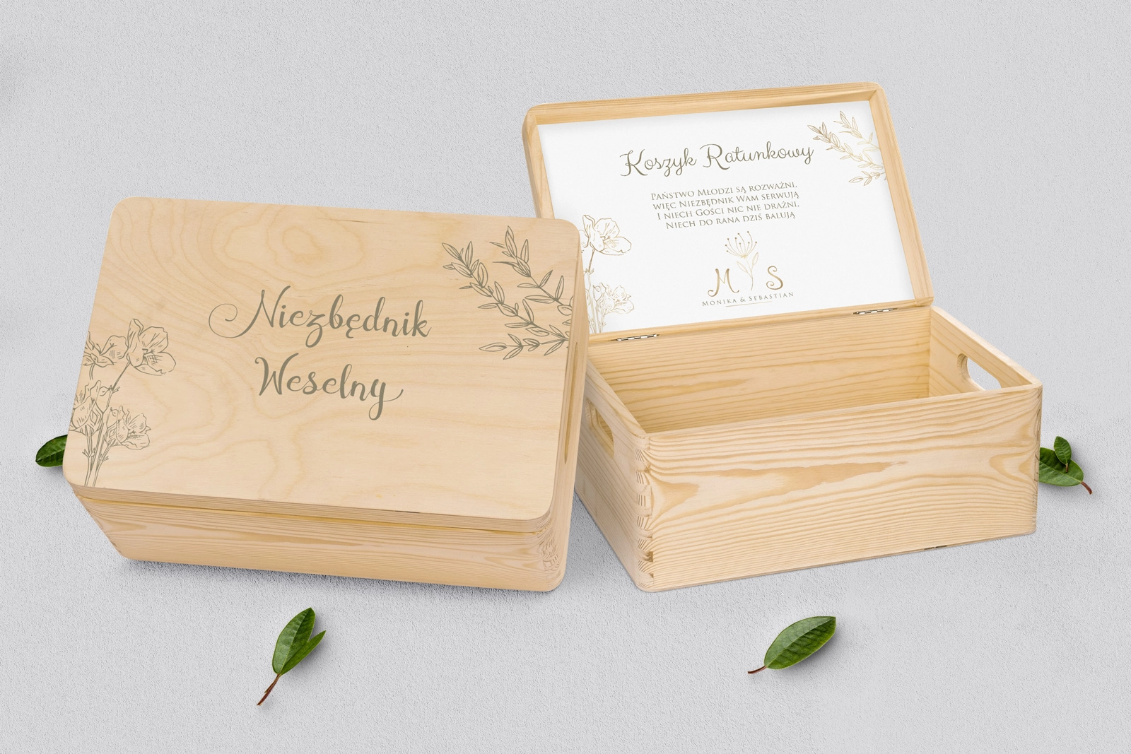 Drewniany koszyczek ratunkowy w kolorze naturalnym z pięknym grawerem w różnych stylach. Solidnie i dokładnie wykonane. Bez problemu pomieści najpotrzebniejsze przedmioty, które mogą przydać się Waszym gościom na weselu. Pudełko można dowolnie spersonalizować własnymi imionami lub dowolnymi napisami. Kolor naturalny doskonale wpasuje się w każde wesele.