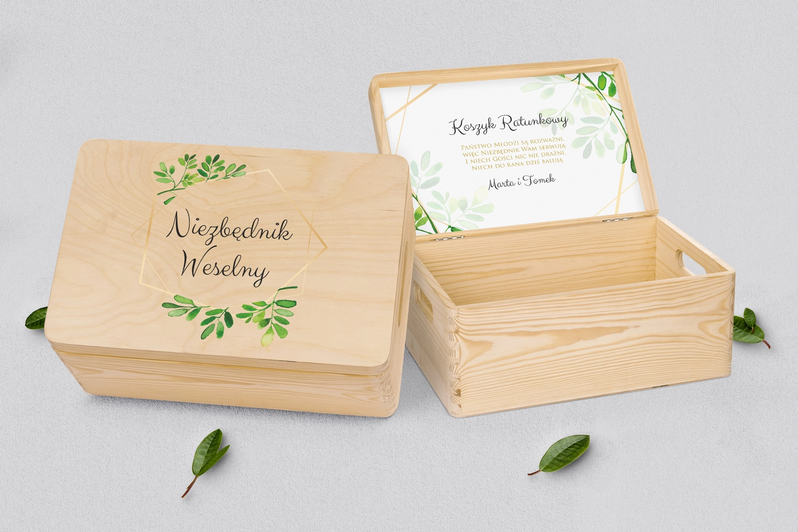 Drewniany koszyczek ratunkowy w kolorze naturalnym z pięknym grawerem w różnych stylach. Solidnie i dokładnie wykonane. Bez problemu pomieści najpotrzebniejsze przedmioty, które mogą przydać się Waszym gościom na weselu. Pudełko można dowolnie spersonalizować własnymi imionami lub dowolnymi napisami. Kolor naturalny doskonale wpasuje się w każde wesele.