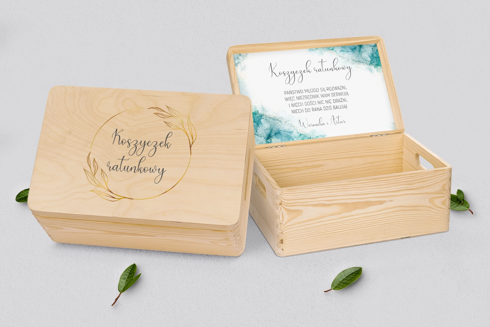 Drewniany koszyczek ratunkowy w kolorze naturalnym z pięknym grawerem w różnych stylach. Solidnie i dokładnie wykonane. Bez problemu pomieści najpotrzebniejsze przedmioty, które mogą przydać się Waszym gościom na weselu. Pudełko można dowolnie spersonalizować własnymi imionami lub dowolnymi napisami. Kolor naturalny doskonale wpasuje się w każde wesele.