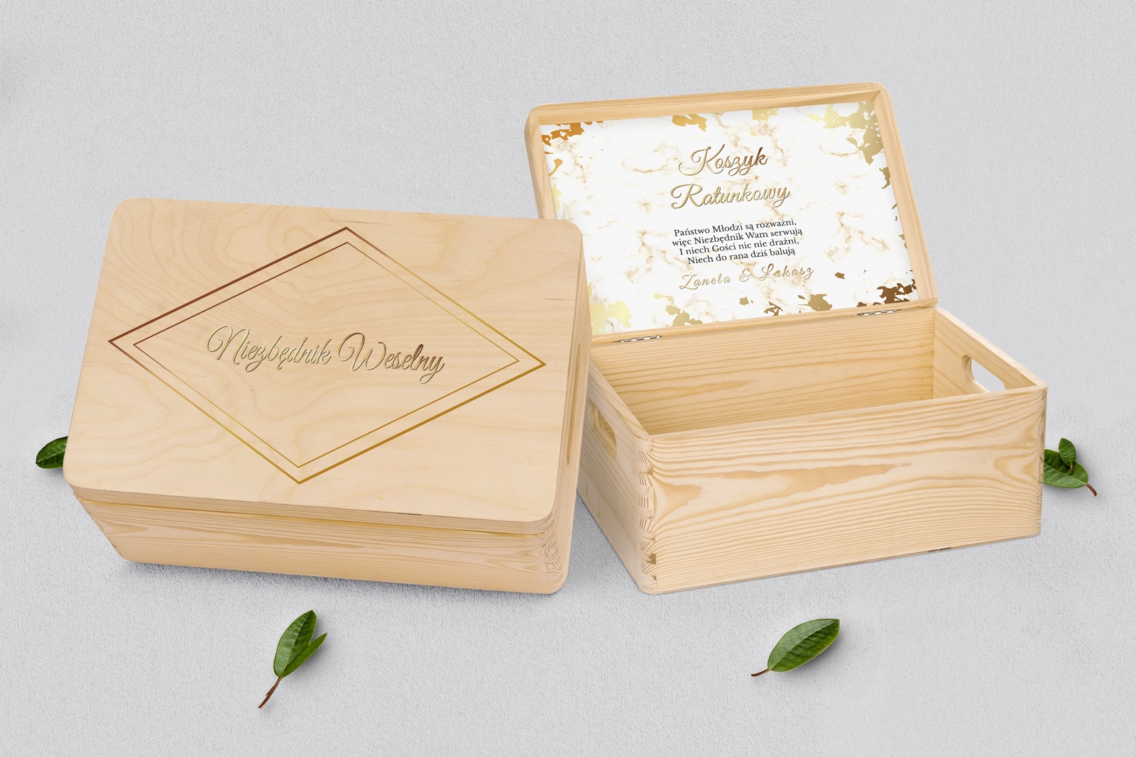 Drewniany koszyczek ratunkowy w kolorze naturalnym z pięknym grawerem w różnych stylach. Solidnie i dokładnie wykonane. Bez problemu pomieści najpotrzebniejsze przedmioty, które mogą przydać się Waszym gościom na weselu. Pudełko można dowolnie spersonalizować własnymi imionami lub dowolnymi napisami. Kolor naturalny doskonale wpasuje się w każde wesele.