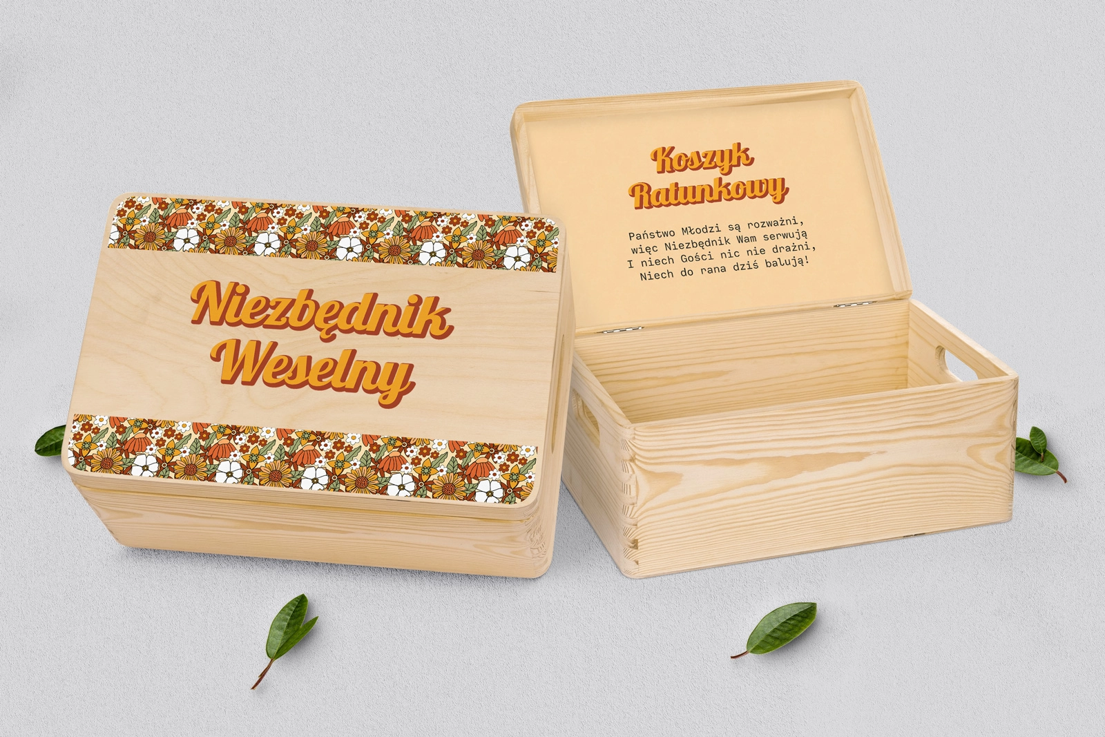 Drewniany koszyczek ratunkowy w kolorze naturalnym z pięknym grawerem w różnych stylach. Solidnie i dokładnie wykonane. Bez problemu pomieści najpotrzebniejsze przedmioty, które mogą przydać się Waszym gościom na weselu. Pudełko można dowolnie spersonalizować własnymi imionami lub dowolnymi napisami. Kolor naturalny doskonale wpasuje się w każde wesele.