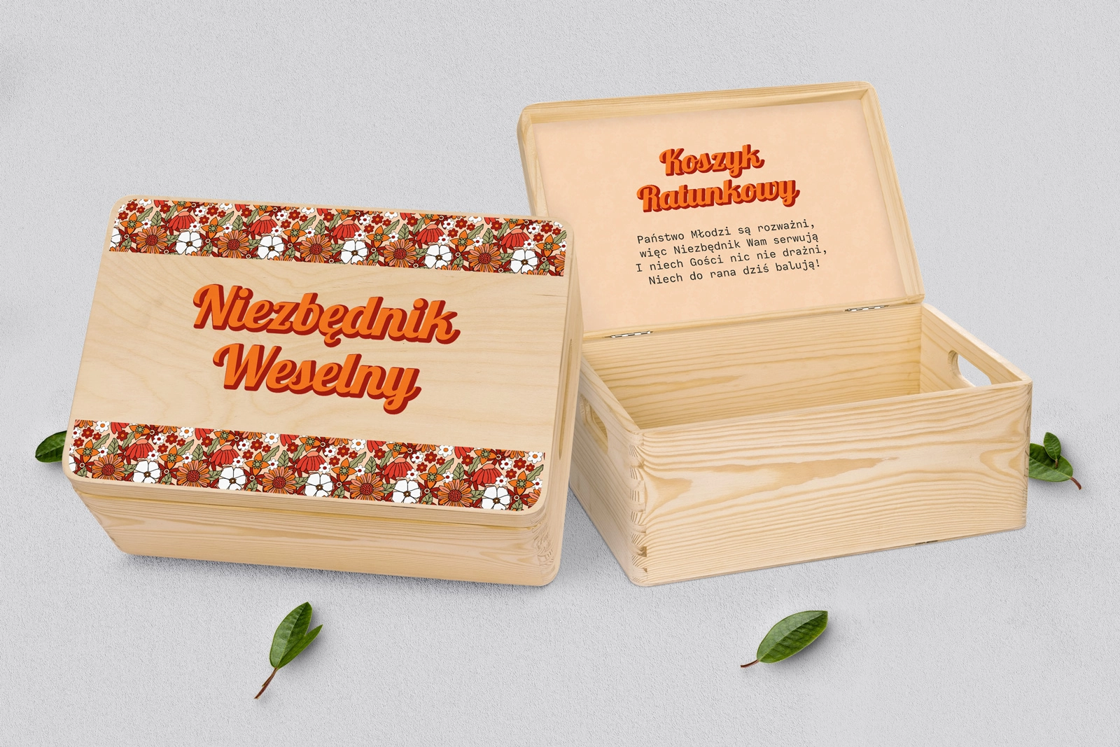 Drewniany koszyczek ratunkowy w kolorze naturalnym z pięknym grawerem w różnych stylach. Solidnie i dokładnie wykonane. Bez problemu pomieści najpotrzebniejsze przedmioty, które mogą przydać się Waszym gościom na weselu. Pudełko można dowolnie spersonalizować własnymi imionami lub dowolnymi napisami. Kolor naturalny doskonale wpasuje się w każde wesele.