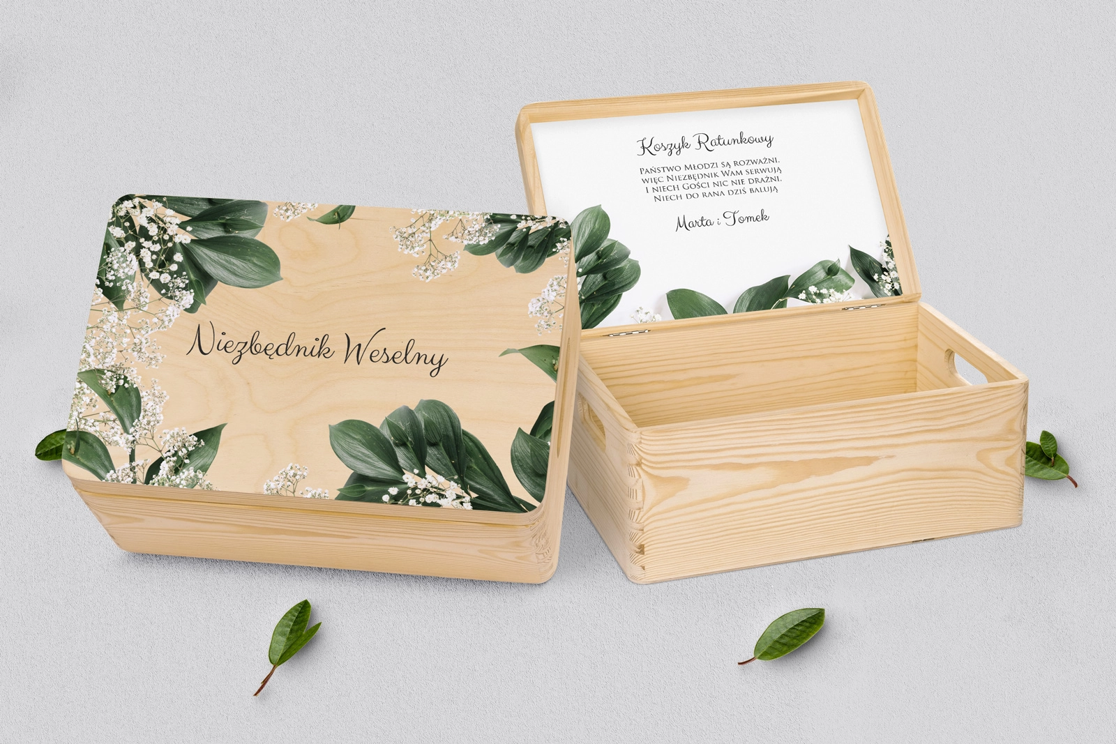 Drewniany koszyczek ratunkowy w kolorze naturalnym z pięknym grawerem w różnych stylach. Solidnie i dokładnie wykonane. Bez problemu pomieści najpotrzebniejsze przedmioty, które mogą przydać się Waszym gościom na weselu. Pudełko można dowolnie spersonalizować własnymi imionami lub dowolnymi napisami. Kolor naturalny doskonale wpasuje się w każde wesele.
