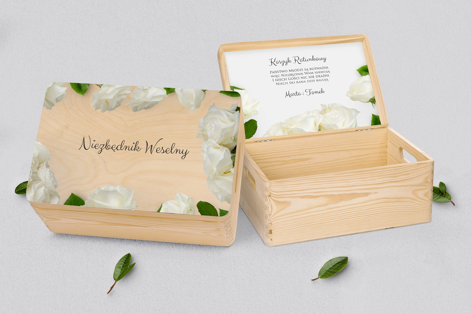 Drewniany koszyczek ratunkowy w kolorze naturalnym z pięknym grawerem w różnych stylach. Solidnie i dokładnie wykonane. Bez problemu pomieści najpotrzebniejsze przedmioty, które mogą przydać się Waszym gościom na weselu. Pudełko można dowolnie spersonalizować własnymi imionami lub dowolnymi napisami. Kolor naturalny doskonale wpasuje się w każde wesele.