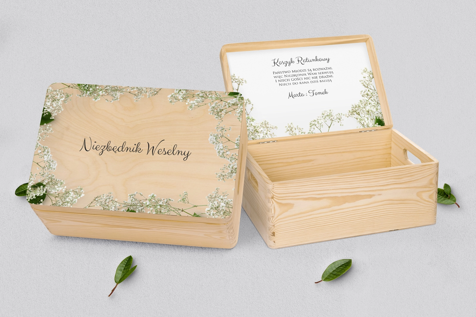 Drewniany koszyczek ratunkowy w kolorze naturalnym z pięknym grawerem w różnych stylach. Solidnie i dokładnie wykonane. Bez problemu pomieści najpotrzebniejsze przedmioty, które mogą przydać się Waszym gościom na weselu. Pudełko można dowolnie spersonalizować własnymi imionami lub dowolnymi napisami. Kolor naturalny doskonale wpasuje się w każde wesele.