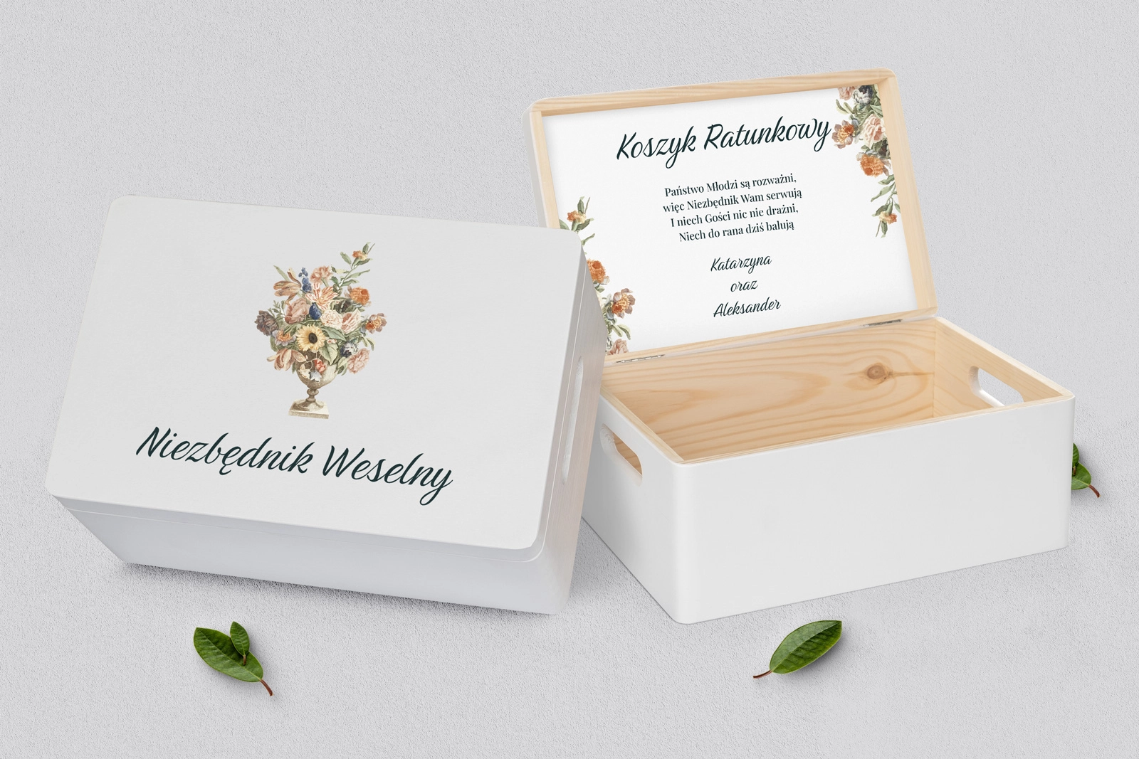 Drewniany koszyczek ratunkowy w kolorze białym z pięknym grawerem w różnych stylach. Solidnie i dokładnie wykonane. Bez problemu pomieści najpotrzebniejsze przedmioty, które mogą przydać się Waszym gościom na weselu. Pudełko można dowolnie spersonalizować własnymi imionami lub dowolnymi napisami. Kolor białym doskonale wpasuje się w każde wesele.