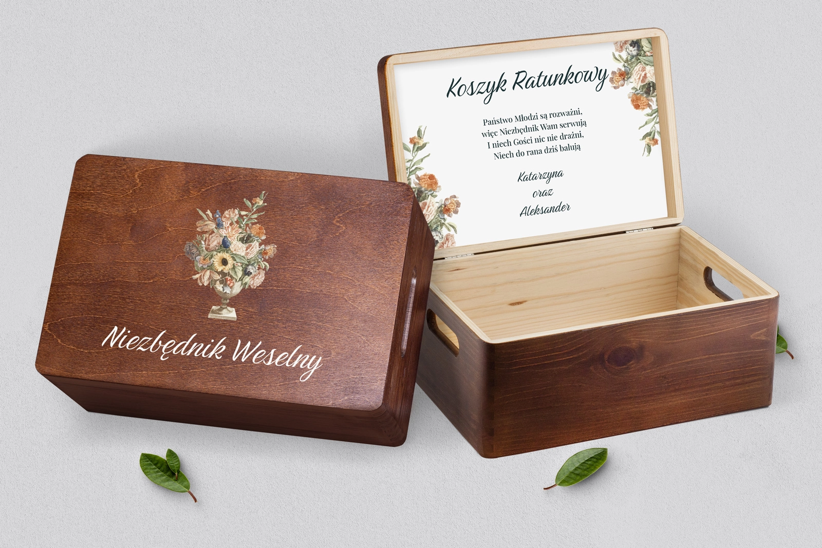 Drewniany koszyczek ratunkowy w kolorze brązowym z pięknym grawerem w różnych stylach. Solidnie i dokładnie wykonane. Bez problemu pomieści najpotrzebniejsze przedmioty, które mogą przydać się Waszym gościom na weselu. Pudełko można dowolnie spersonalizować własnymi imionami lub dowolnymi napisami. Kolor brązowy doskonale wpasuje się w każde wesele.