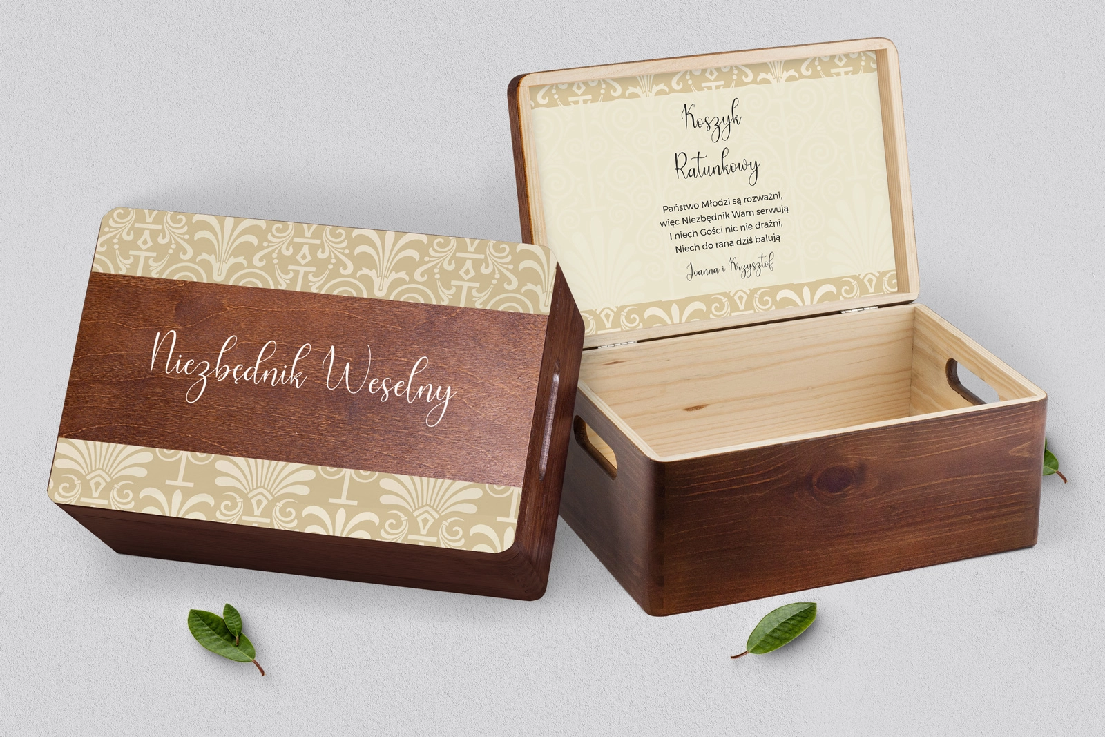 Drewniany koszyczek ratunkowy w kolorze brązowym z pięknym grawerem w różnych stylach. Solidnie i dokładnie wykonane. Bez problemu pomieści najpotrzebniejsze przedmioty, które mogą przydać się Waszym gościom na weselu. Pudełko można dowolnie spersonalizować własnymi imionami lub dowolnymi napisami. Kolor brązowy doskonale wpasuje się w każde wesele.