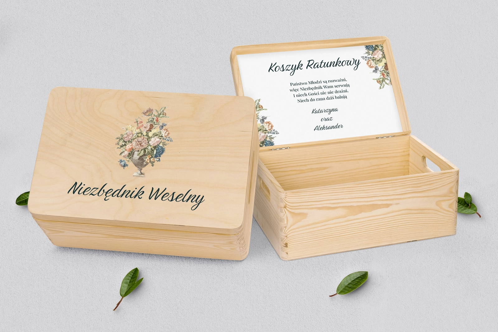 Drewniany koszyczek ratunkowy w kolorze naturalnym z pięknym grawerem w różnych stylach. Solidnie i dokładnie wykonane. Bez problemu pomieści najpotrzebniejsze przedmioty, które mogą przydać się Waszym gościom na weselu. Pudełko można dowolnie spersonalizować własnymi imionami lub dowolnymi napisami. Kolor naturalny doskonale wpasuje się w każde wesele.