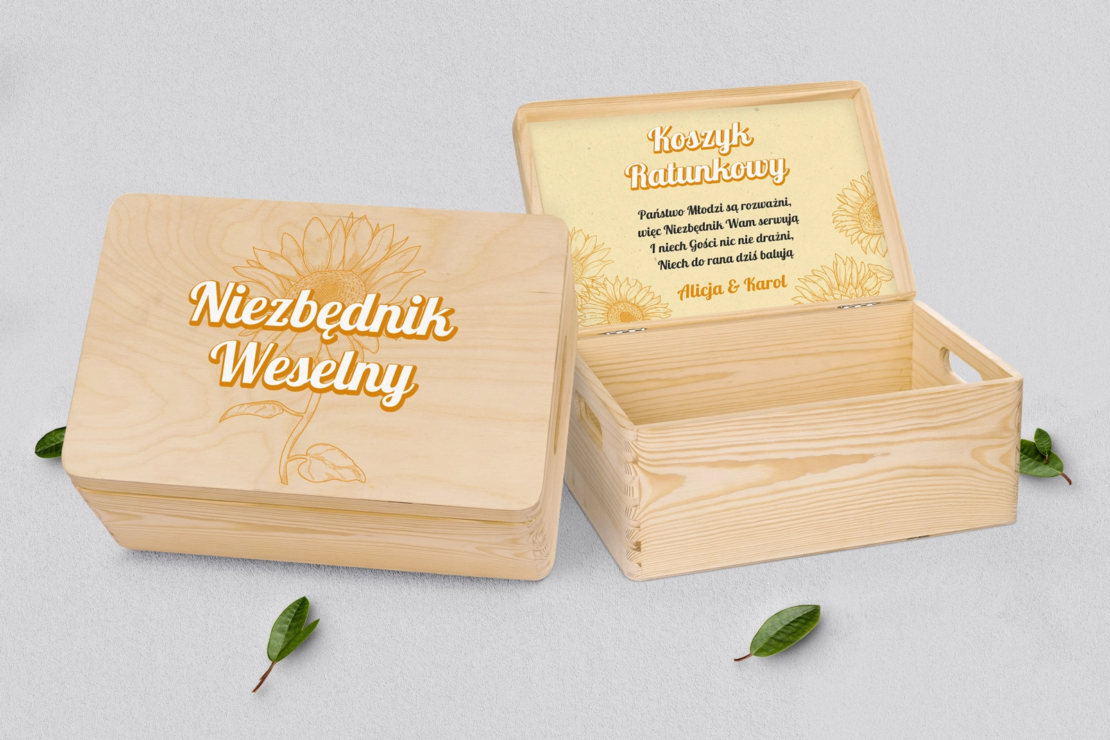 Drewniany koszyczek ratunkowy w kolorze naturalnym z pięknym grawerem w różnych stylach. Solidnie i dokładnie wykonane. Bez problemu pomieści najpotrzebniejsze przedmioty, które mogą przydać się Waszym gościom na weselu. Pudełko można dowolnie spersonalizować własnymi imionami lub dowolnymi napisami. Kolor naturalny doskonale wpasuje się w każde wesele.