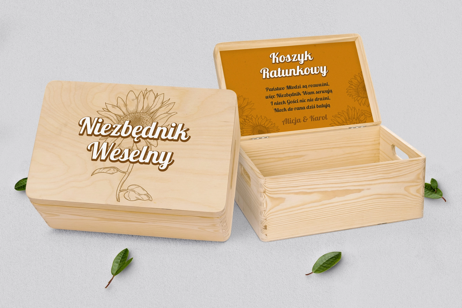 Drewniany koszyczek ratunkowy w kolorze naturalnym z pięknym grawerem w różnych stylach. Solidnie i dokładnie wykonane. Bez problemu pomieści najpotrzebniejsze przedmioty, które mogą przydać się Waszym gościom na weselu. Pudełko można dowolnie spersonalizować własnymi imionami lub dowolnymi napisami. Kolor naturalny doskonale wpasuje się w każde wesele.