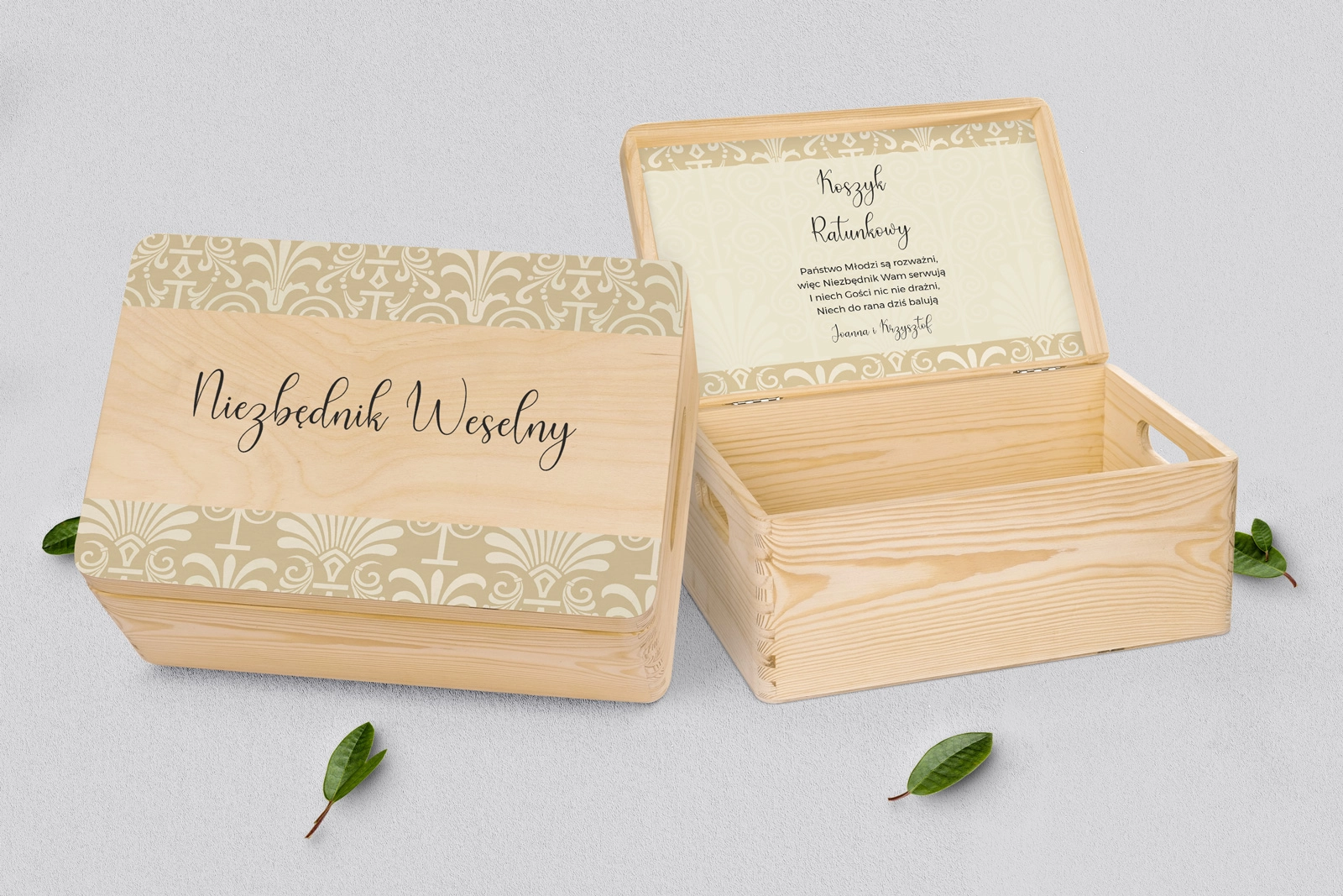 Drewniany koszyczek ratunkowy w kolorze naturalnym z pięknym grawerem w różnych stylach. Solidnie i dokładnie wykonane. Bez problemu pomieści najpotrzebniejsze przedmioty, które mogą przydać się Waszym gościom na weselu. Pudełko można dowolnie spersonalizować własnymi imionami lub dowolnymi napisami. Kolor naturalny doskonale wpasuje się w każde wesele.