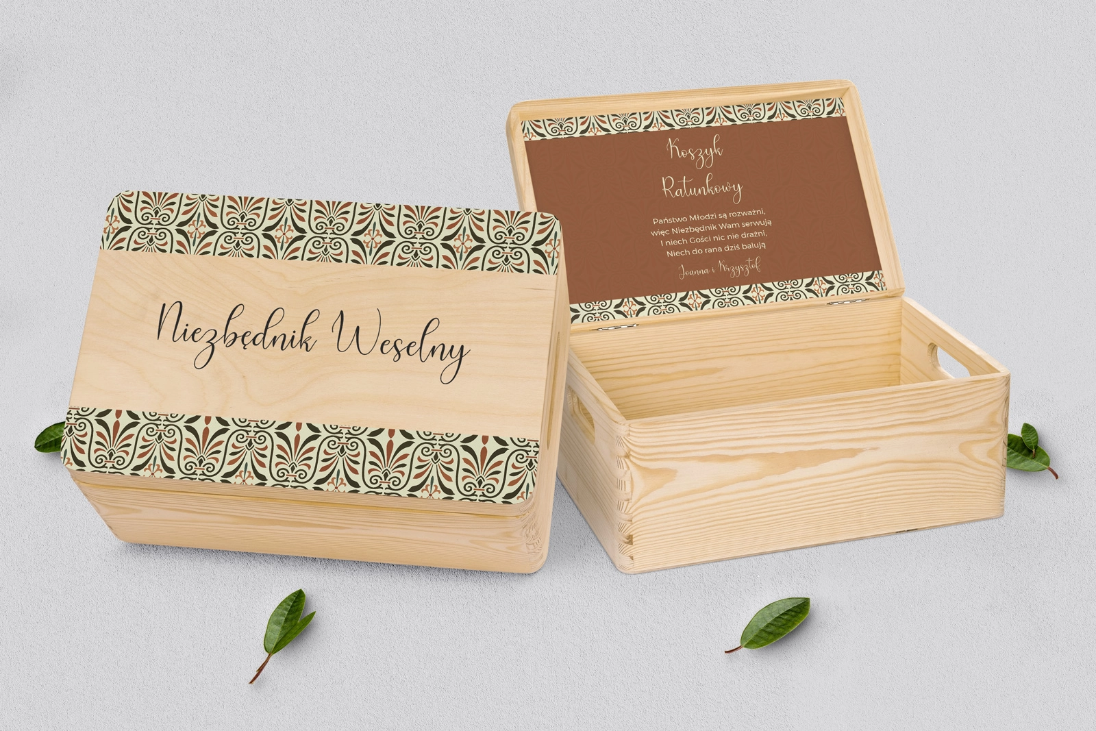 Drewniany koszyczek ratunkowy w kolorze naturalnym z pięknym grawerem w różnych stylach. Solidnie i dokładnie wykonane. Bez problemu pomieści najpotrzebniejsze przedmioty, które mogą przydać się Waszym gościom na weselu. Pudełko można dowolnie spersonalizować własnymi imionami lub dowolnymi napisami. Kolor naturalny doskonale wpasuje się w każde wesele.