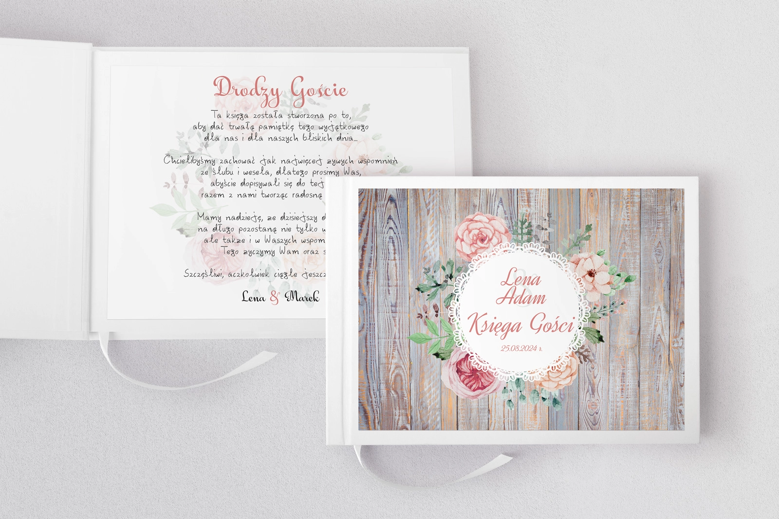 Księgi Gości Rustical to połączenie wiejskiego stylu z nowoczesnością i przestronnością. Wspaniałe deski w tle podkreślają rustykalny klimat a kwiaty jak namalowane dodają gracji i harmonii. Oprócz tego piękna serwetka na której są jak wyhaftowane Wasze imiona wraz ze wspaniałą dedykacją dla gości.