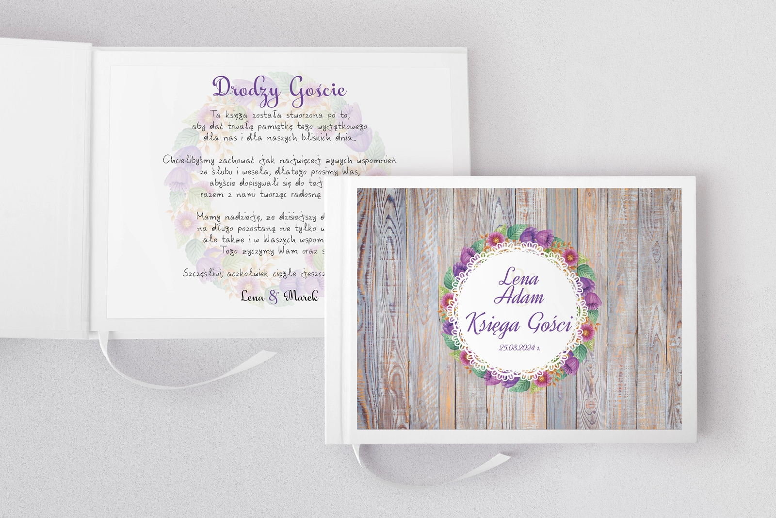Księgi Gości Rustical to połączenie wiejskiego stylu z nowoczesnością i przestronnością. Wspaniałe deski w tle podkreślają rustykalny klimat a kwiaty jak namalowane dodają gracji i harmonii. Oprócz tego piękna serwetka na której są jak wyhaftowane Wasze imiona wraz ze wspaniałą dedykacją dla gości.