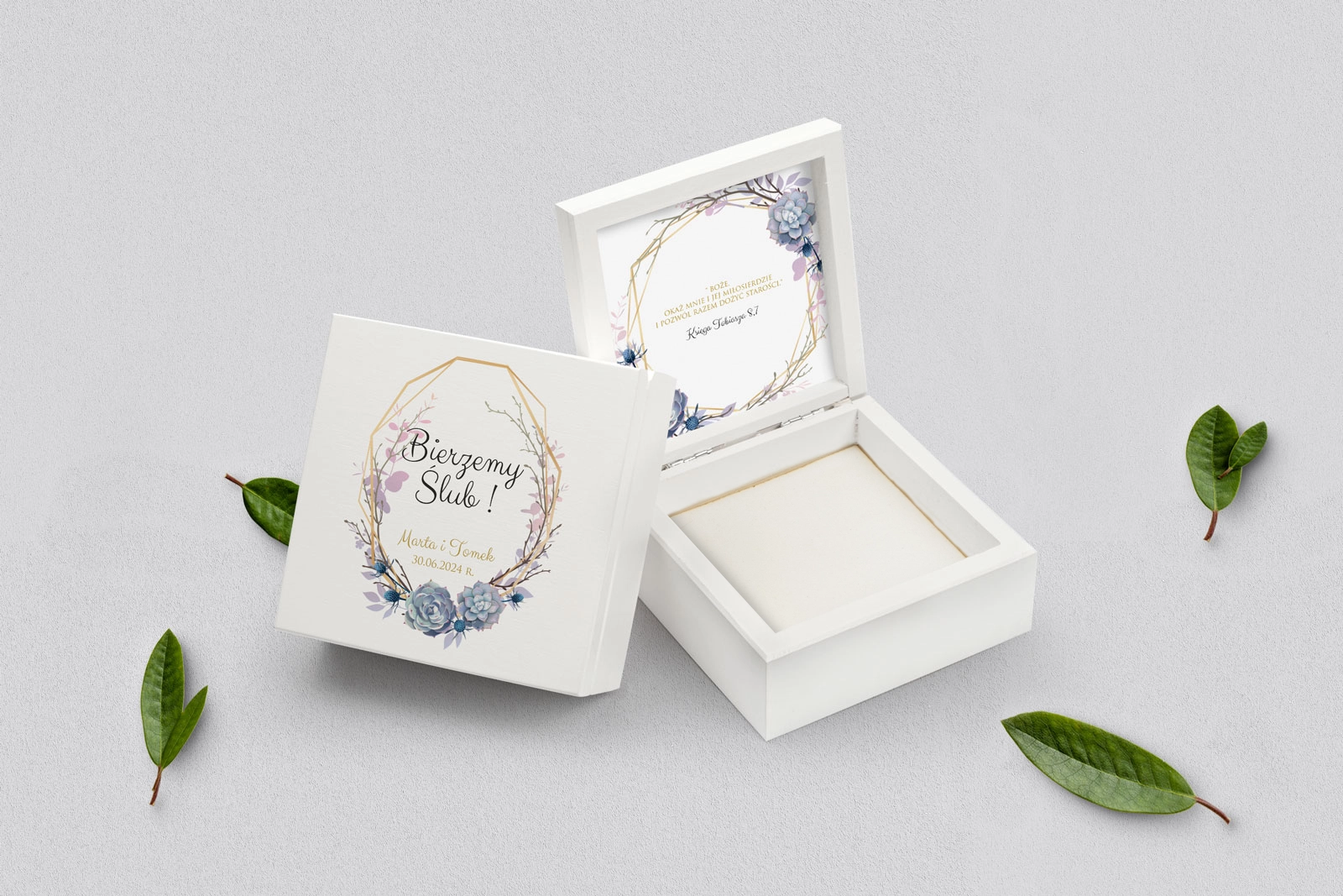 Na tej karcie produktu kupujesz Pudełka na obrączki w konfiguracji określonej w specyfikacji.